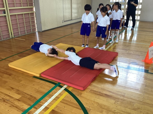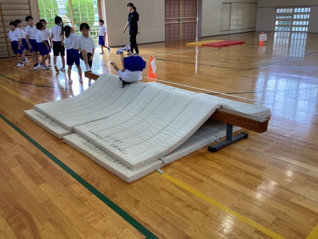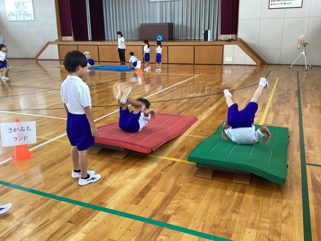 マットを使った運動遊びを楽しんでいます。二人組で回ったり、体を支えながら回転したりする動きが上手になってきました。平均台の上での前回りは落ちてしまっても楽しいようで、繰り返し練習に取り組む姿が見られました。