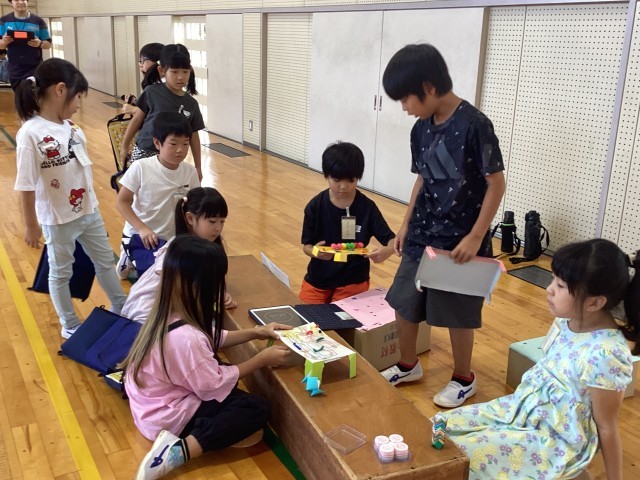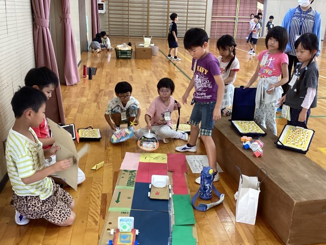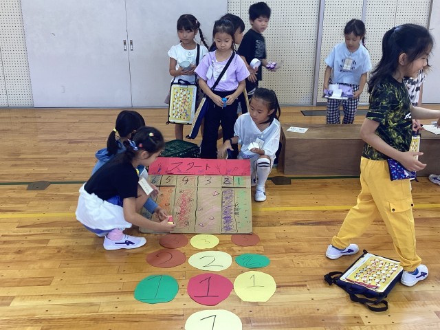 10月2日(木)に1年生は、2年生からおもちゃフェスティバルに招待してもらいました。2年生のお兄さんお姉さんから、おもちゃの遊び方を教えてもらったり、折り紙で作ったお土産をもらったりした1年生は、とてもうれしそうでした。「とっても楽しかった!」「お土産ももらえた!やった!」という声がたくさん聞こえてきました。この日のために1年生が遊べるおもちゃを計画して作り上げ、お土産まで準備してくれた2年生、どうもありがとう!!