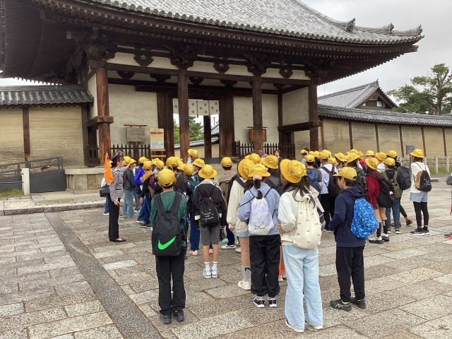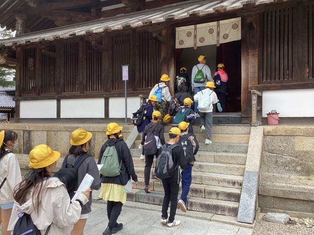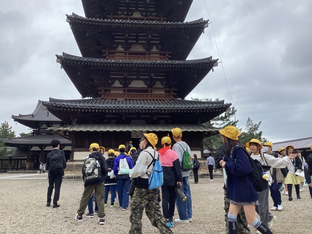 世界最古の木造建築の五重塔や貴重な展示物を、ガイドさんに案内してもらいながら見学しました。