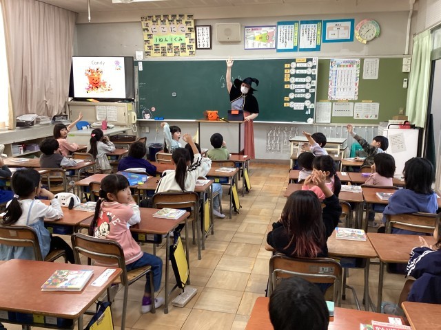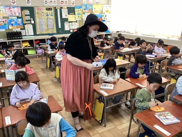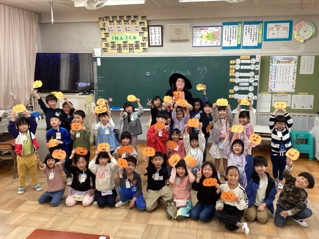 1年生は、外国語の授業では、魔女の格好をした先生から「Ⅿy name is ~」を使っての自己紹介の仕方を学びました。また、ハロウィン制作では、「Ⅿy pumpkin」を作りました。様々な顔のパンプキンが完成し、笑顔で集合写真を撮りました。