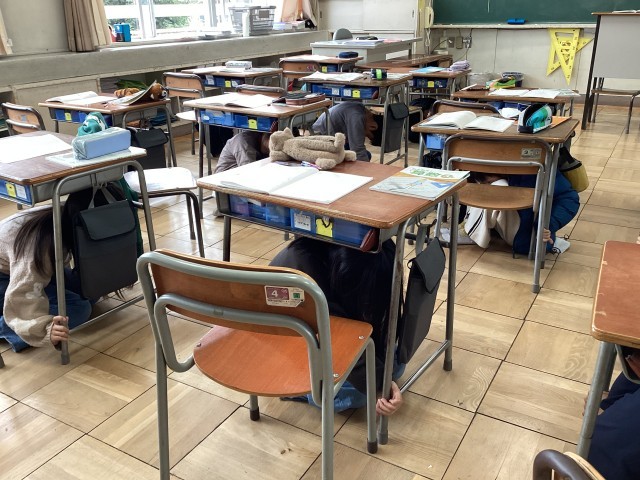 町の緊急地震速報訓練の放送で、シェイクアウト訓練を行いました。