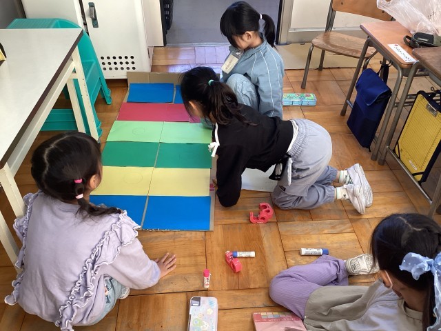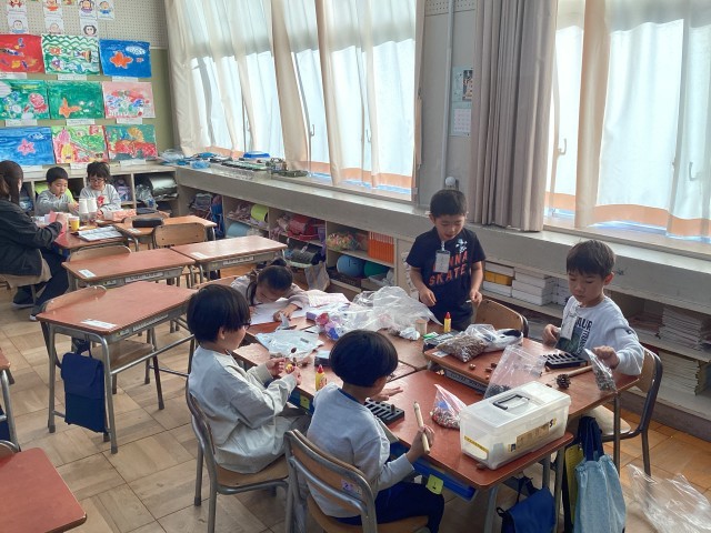 1年生は生活科で秋祭りを開くための準備をしています。秋の食べ物屋さんや、どんぐりゴマ屋さん、秋の輪投げ屋さん、どんぐり的入れ屋さん、秋の楽器屋さん、秋の小物屋さんのグループに分かれて、必要なものを準備して制作に取り掛かりました。どんぐりに穴を空けてこまや小物を作ったり、きれいな落ち葉を飾りに使ったりと、どのグループも意欲的に取り組んでいます。秋祭りが楽しみですね。