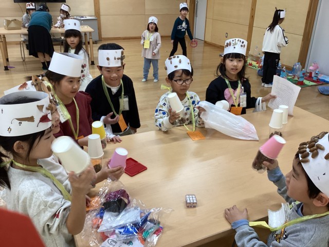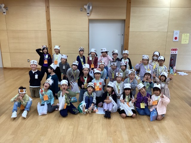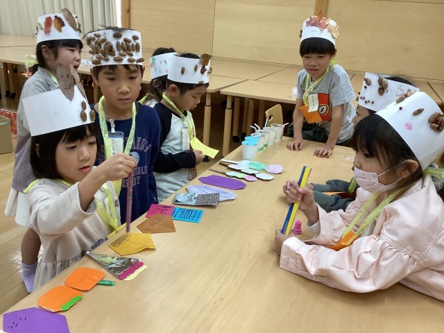 1年生は秋祭りをしました。初めにみんなで「まっかなあき」を元気に歌いました。その後、前半後半のグループに分かれて準備をし、様々なコーナーを回りました。どんぐりゴマのグループは、回転しやすいコマを勧めてくれました。また、どんぐり的投げグループは2年生のおもちゃフェスティバルのときのように説明がとても丁寧で分かりやすかったです。どのグループも活気のある楽しい活動ができました。最後に秋のバンダナを付けてみんなで記念撮影をしました。実りのある時間がもててよかったです。