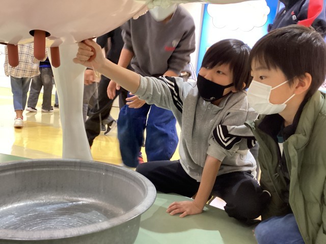 ホルスタインの大きさの模型で乳しぼり体験をさせていただきました。