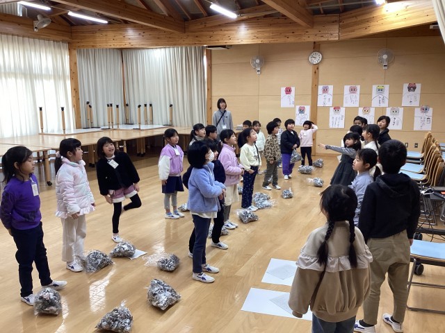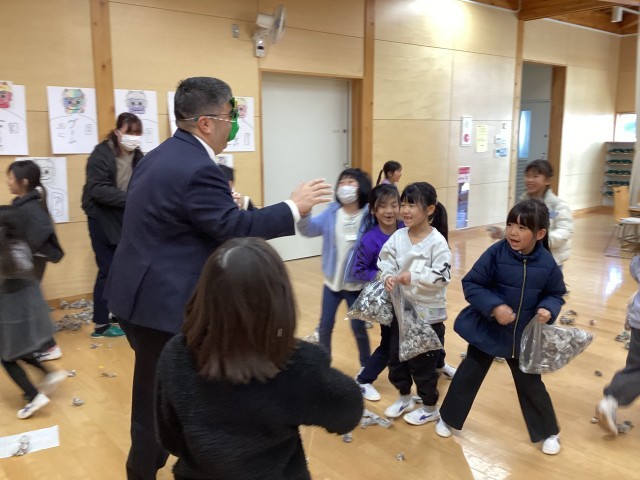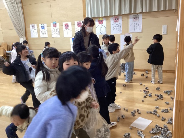 1年生は、生活科で節分集会をしました。初めにみんなで声を合わせて「まめまき」の歌を歌いました。次に自分の心の中にいる悪い鬼を新聞紙で作った豆で退治しました。タブレットばかり見てしまう「タブレットおに」や片づけをしない「かたづけおに」、夜遅くまで起きてしまう「よるおそおに」など様々な鬼を退治しました。するとそこに緑鬼と赤鬼が登場!初めは「キャー!!」と叫び声が上がり驚いていましたが、すぐにみんなで力を合わせて「鬼は外!!」と大きな声で鬼を退治しました。