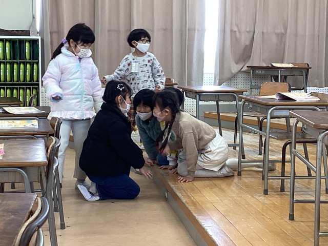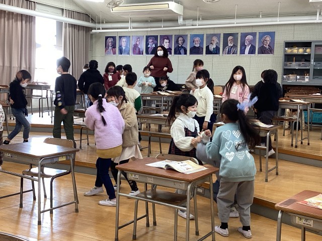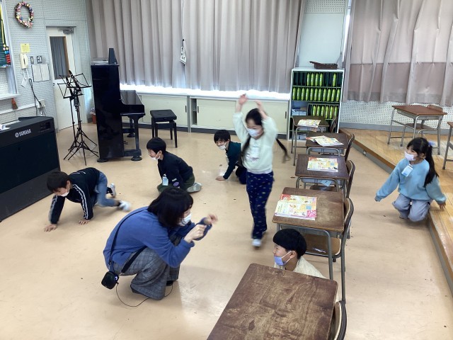 1年生は音楽で「おどるこねこ」に合わせて表現活動をしました。最初に音楽を聞いたときは「ねこみたいな声が聞こえた!」「最後にワン!ワン!って犬の声がした!」と聞こえた音について話し合いました。その後、音楽に合わせての表現活動では、こねこのように歩いたり、ねこの手をしながら友達同士で顔を見合わせてみたりと楽しそうな姿がたくさん見られました。