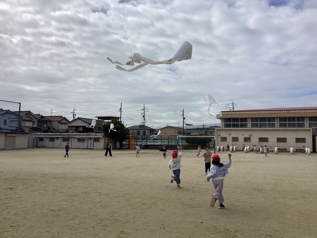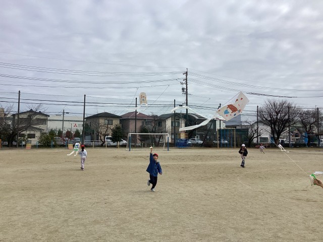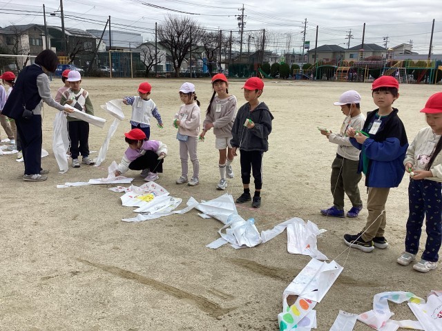 1年生は、生活の時間で作った凧を揚げました。走って揚げるときは、お友達に近づいて絡まらないように気を付けることなどの注意事項を確認したら、2つのグループに分かれて順番に揚げました「先生見て!凧が揚がってるよ!」「早く走るから見てて!」など、走ると凧が風に乗って高く揚がることに喜ぶ子どもたちの様子がたくさん見られました。