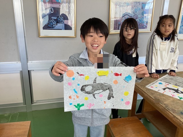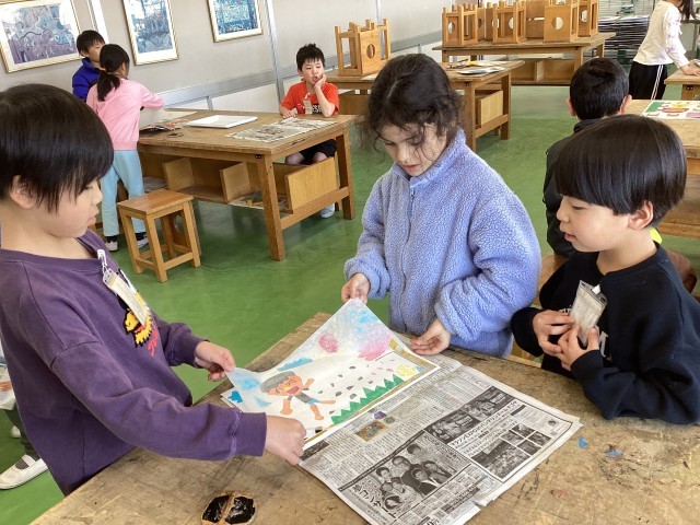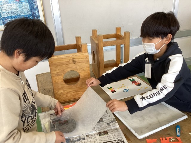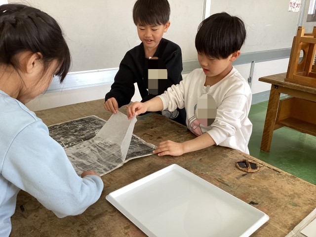 3月10日、11日の図工の授業で、紙版画を刷りました。子どもたちは2年生の思い出や、楽しかったことなどを表現することができました。初めての紙版画に緊張や苦戦する様子も見られましたが、どの班も協力して作品作りができました。