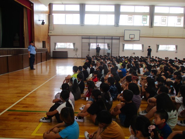 本日、不審者対応訓練を行いました。西枇杷島警察署の方が不審者役として校内に侵入するという想定で行いました。要求をしてくる不審者に対して、先生方も必死に対応していました。児童は、教室内にバリケードを作り、不審者から見えないように身を隠し、不審者確保後にはしゃべらず講堂に避難することができました。今回の訓練で学んだことを生かし、児童が毎日を安全に過ごすことができるよう、学校全体で安全管理に努めていきたいと思います。