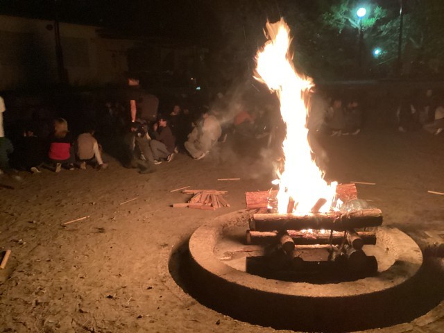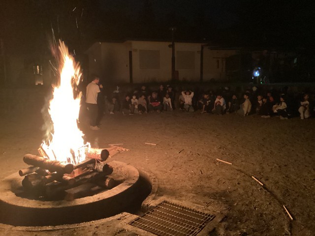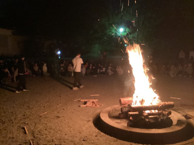 キャンプファイヤーが始まりました。楽しくスタンツをしています。