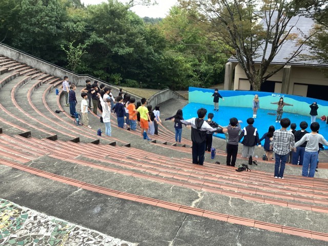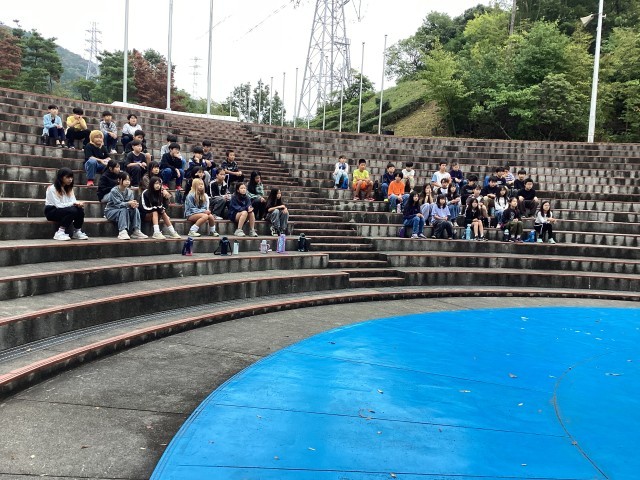 野外学習2日目です。野外ステージでの朝のつどいの様子です。元気よくラジオ体操をし、話を真剣に聞いています。昨日は無事に全ての活動を終えることができました。特にキャンプファイヤーはとても盛り上がりました。今日も一日がんばります。