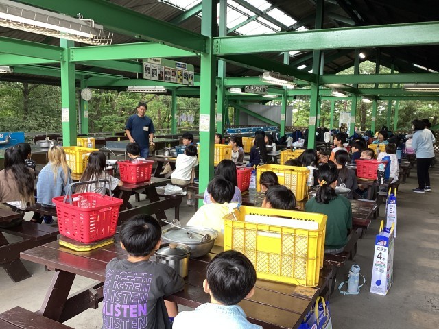 炊事場で所員から説明を聞いている様子です。今からカレーを作ります。