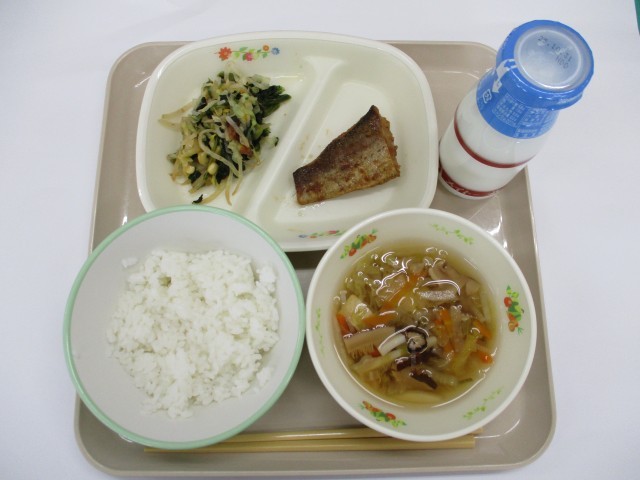 今日の給食は、ごはん、牛乳、八杯汁、たらの七宝みそ焼き、ほうれんそうのおかかあえでした。たらの七宝みそ焼きは、たらという魚に、あま市七宝町で作られている七宝みそをつけて焼いた料理です。みそには、米みそ、麦みそ、豆みそがありますが、愛知県では、豆みそがたくさん作られています。七宝みそは、大豆と塩、水だけを使い、昔から伝わる古い木の桶の中で、長い間熟成させて作るため、コクがあります。魚の苦手な子にも、みそ味で食べやすかったです。