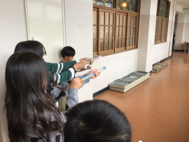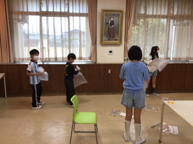 理科の授業で、「とじこめた空気と水」の学習をしています。プラスチックの筒に詰めた玉を飛ばしたり、袋に空気を閉じ込めて手応えを確かめたりして、学習課題を見出そうとしました。