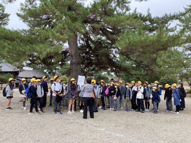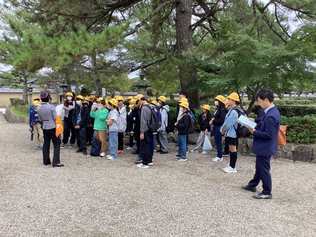 バスガイドさんの説明をしっかりと聞いています。