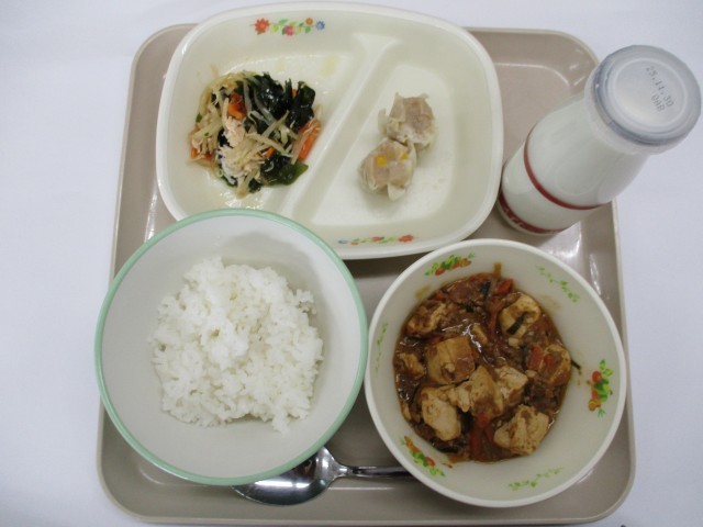 今日の給食は、ごはん、牛乳、マーボー豆腐、コーンしゅうまい、わかめともやしの中華あえでした。 マーボー豆腐は、給食でカレーライスと同じくらい人気の料理です。給食のマーボー豆腐は、豆腐、豚ひき肉の他に、玉ねぎ、にんじん、しいたけ、にらなどの野菜がたくさん入っているのが特徴です。また、細かく刻んだ大豆や鶏レバーも入っていて、栄養満点です。ごはんにマーボー豆腐をのせて、マーボー丼にして食べている子もいました。寒くなってきたので、給食をしっかり食べて体調を整え、かぜをひかないようにしたいですね。