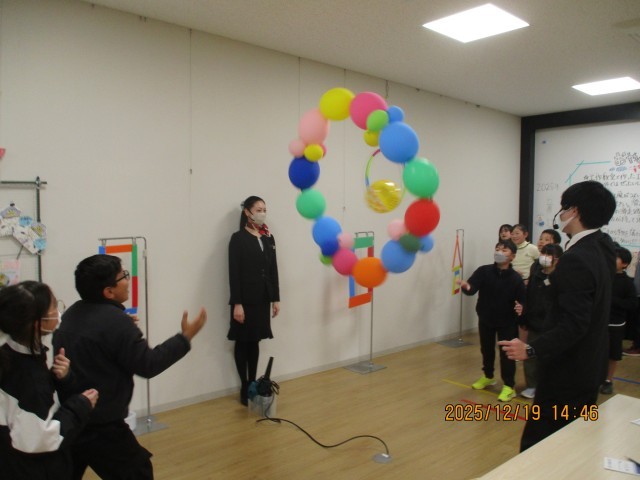 サイエンスラボでは、飛行機が飛ぶ仕組みを学習し、ブロワーを使ってボールを浮かせる実験をしました。また、風船のリングを浮かせる実験も見せてもらいました。