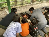 飯盒炊飯の説明を聞いています。今から炊事場へ向かいます。