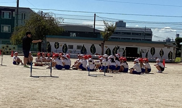 ハードル走で大切なポイントの説明を受け、自分の歩幅に合ったコースで何回も挑戦しました。そのうち、友達同士で改善点を伝え合うなどの姿も見られました。