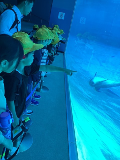 10月24日金曜日、1・2年生は校外学習で名古屋港水族館へ行きました。大きな水槽を泳ぐベルーガやイルカ、たくさんの魚たちに子どもたちは目を輝かせていました。
