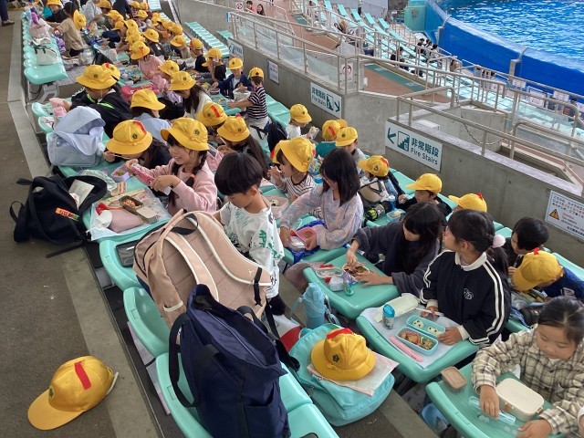 イルカショーの後のお弁当の時間には、みんなで楽しくお話をしながら、持ってきたお弁当を食べ、笑顔があふれていました。