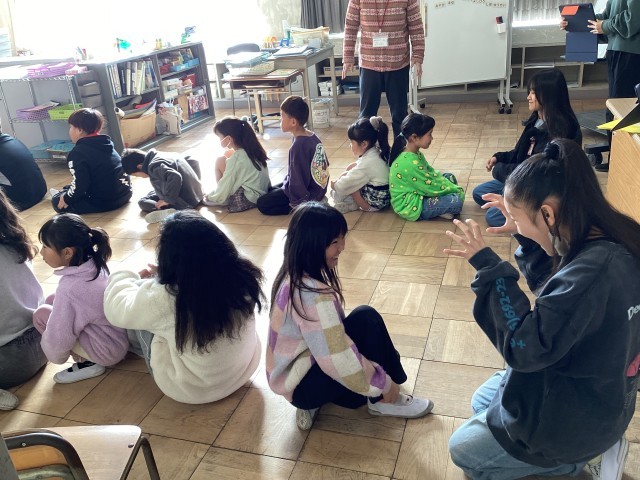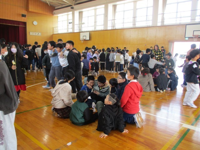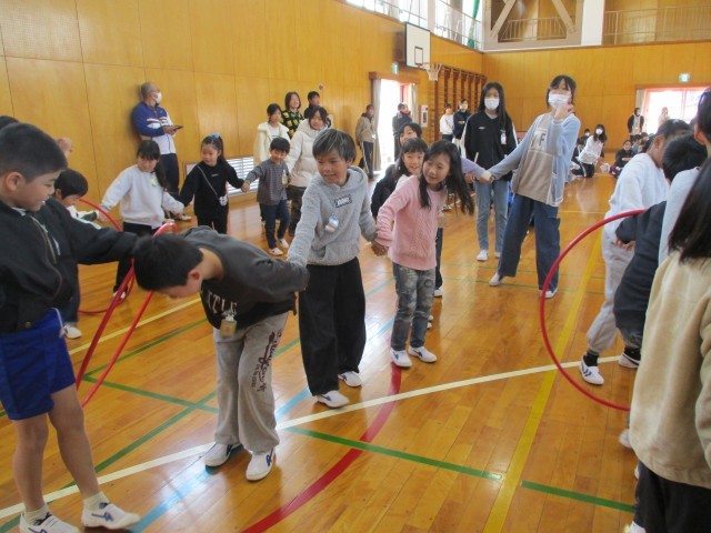 また、体育館では手をつないで、フラフープをくぐるゲームをしました。高学年が低学年に声をかけ、助け合いながら、進めていました。成功した時には、班のみんなで喜びあう様子が印象的でした。