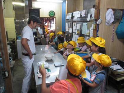 見学先に到着すると、お店の人にあいさつをし、施設やお店の中を見学させてもらいました。自分の通っていた幼稚園や保育園を訪れた子は、「あっちにすみれ組の教室があるよ!」「知っている先生がたくさんいる!」と教えてくれました。