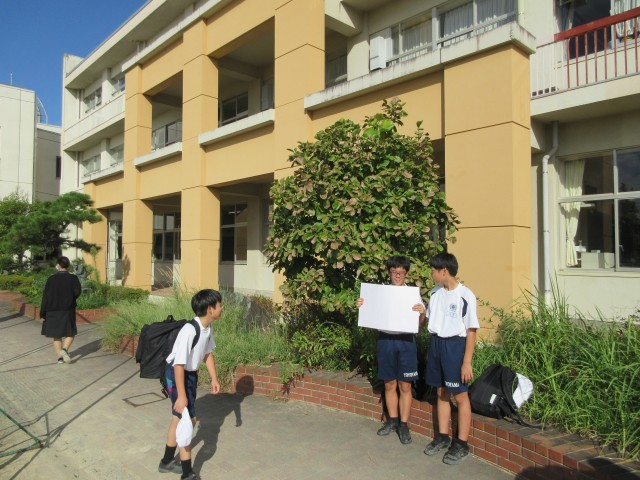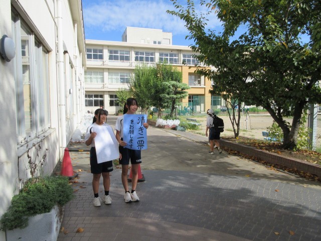 立会演説会に向けて、9月16日(火)から、毎朝昇降口に立ち、元気よく挨拶をしながら選挙活動を行いました。立会演説で、立候補した生徒は、豊山中学校をよりよい学校にしていきたいという思いを込めて、堂々とした演説しました。