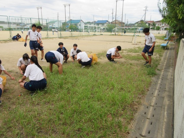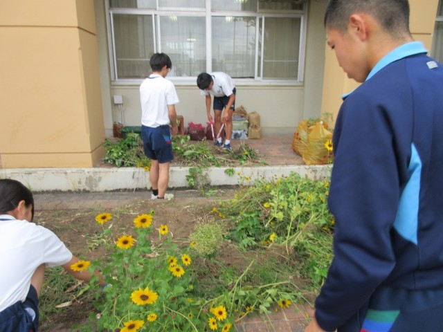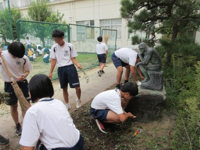 多くの生徒が参加し、夏の期間に伸びてしまった雑草を根から引き抜きました。