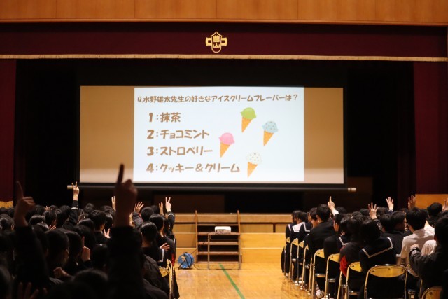 まず、3年生担当の先生に関するクイズ大会で盛り上がりました。次に、豊山中で過ごした3年間の思い出の写真がスクリーンに映し出され、懐かしさとともに、これまでの成長を実感できる会になったのではないかと思います。