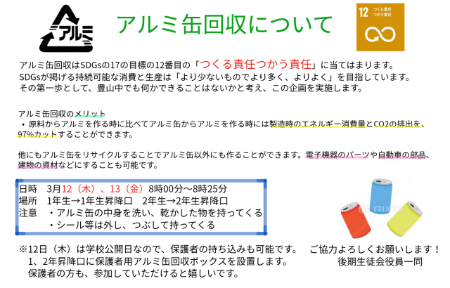 3/12(木)、13(金) 生徒会主催 アルミ缶回収について