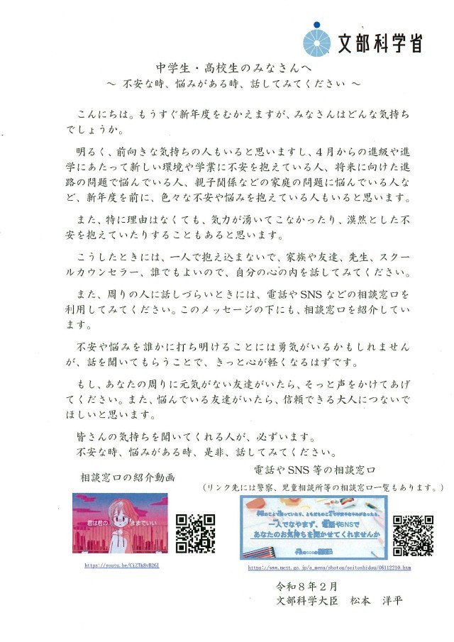 本日、文部科学大臣からのメッセージを生徒に配付しました。