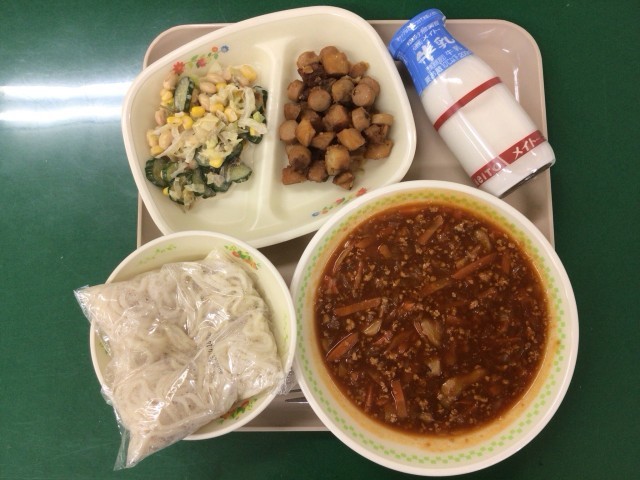 献立は、ソフトめん、牛乳、ミートソース、じゃがいもとウィンナーのカレー炒め、大豆と小魚のカミカミあえ です。