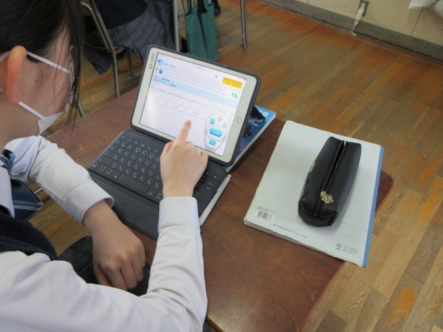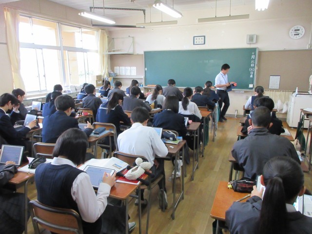 社会科の授業の様子です。タブレットを活用して学習しています。
