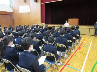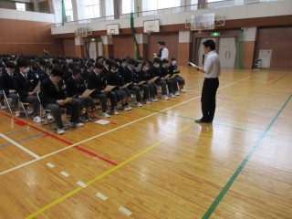 学年集会にて、進路指導主事から上級学校の体験入学について説明しました。生徒は真剣に話を聞いていました。ぜひ積極的に体験入学に参加して、進路選択の参考にしてもらいたいと思います。