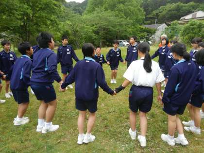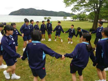 「右」と言われたら、みんなで声をそろえて「左」と言います。しかし、輪になって移動する方向は「右」。みんな大混乱です。