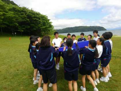 空高く舞い上がったニワトリのジョニーをみんなで協力してブルーシートでキャッチします。なかなか真っ直ぐに翔んでくれなくて大苦戦です。