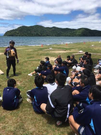 いかだ体験学習が始まりました。各クラスで旗に名前を書いて、今からいかだつくりに入ります。
