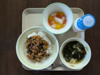献立は、麦ごはん・牛乳・わかめスープ・ビビンバ丼・杏仁フルーツゼリーです。